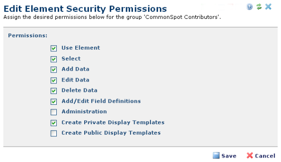 To grant permissions, check one or more check boxes, and click Save to apply permission changes to the current Element.