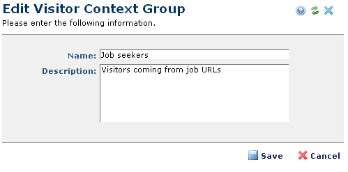 Access this dialog from the Visitor Context Groups dialog to change or create groups that are served content based on rules created for your site. This dialog displays in edit mode for existing groups, as shown below.