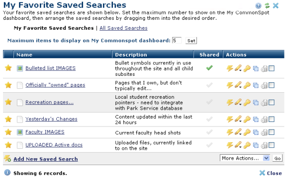 In addition, contributors can create and save frequently used or specialized search queries for faster, more focused search operations. CommonSpot supports storing both page and image searches, favorites for quick access, and sharing saved searches for reliably distributing and updating commonly used data sets.