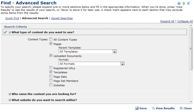 CommonSpot includes quick find, advanced search, and saved search functionality. All of these options are available for retrieving pages, templates, images, and other CommonSpot files.