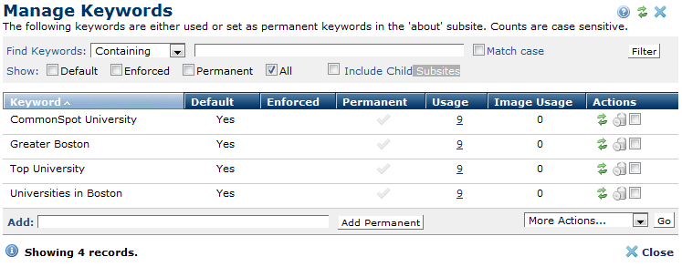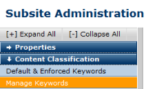 CommonSpot provides practical administrative control over keyword creation and management at the individual subsite level, which helps you better classify your content and for categorizing and internal searching.