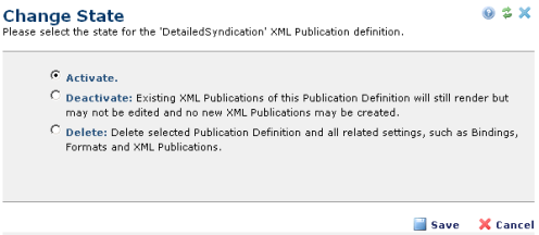 Clicking the Deleteicon or picking Change State from the edit menu for a Custom Element in Manage Elements gives you options for activating, deactivating, or deleting the Element, as described below. You cannot apply these options to CommonSpot factory Elements. "Deleting" suppresses rendering of existing instances and disallows new instances, but does not remove Element data from the system.