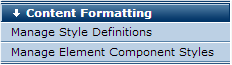 You can assign styles to individual CommonSpot Elements or their subcomponents and set global style defaults. Style classes can be made available for use with multiple Element components and each component can have multiple classes available for use with it. Only contributors with with Style privileges can select a particular class for CommonSpot elements or element subcomponents