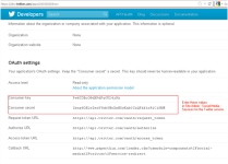 10. In the Details tab, scroll down to the Oauth Settings section and copy the Consumer Key and Consumer Secret. Enter these values in Commonspot Site Admin - Social Media Services. Click the edit icon for the Twitter service, enter the Consumer ID and Consumer Secret properties, and save.