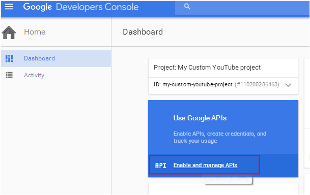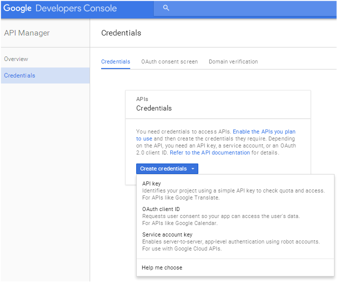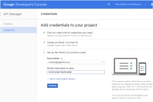 1. If this is your first time using the Google Developer's Console, review the Google recommendations for developer-specific accounts and create or use an account appropriate for permanent association with this application. Accept the Terms of Service and register. Review Google documentation for "Credentials, access, security, and identity," "Setting up OAuth 2.0," and "Setting up API keys."