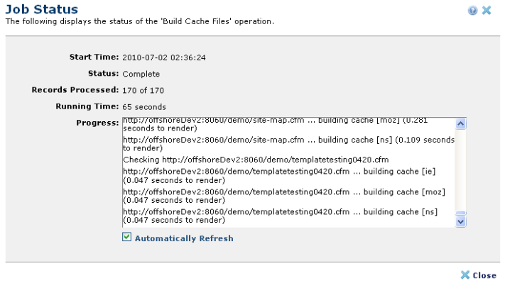By default, job progress displays automatically. (Updates to this dialog may take focus in some browsers.) To maintain job status "in the background," uncheck Automatically Refresh, then use the Refresh button to manually view status, as shown below.