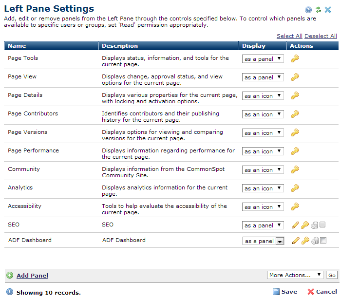For CommonSpot "factory" panels, clicking the security icon displays options for changing view privileges. For custom options, clicking the security icon
