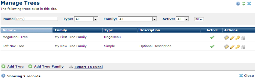 You can filter for trees using any combination of Tree name, type, family, or status. Optionally enter a name string to match (defaults to any) The Tree Type dropdown displays types defined for your site. The Family dropdown filters for categories created for your site. The Active menu filters for active/inactive trees. Use one or all of these dropdowns and click the Filter button to restrict results.
