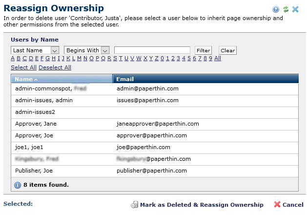 Use this dialog to select a user to inherit permissions, page ownership, and any work-in-progress for the user targeted for deletion. This dialog displays when you delete a user with current CommonSpot activity.