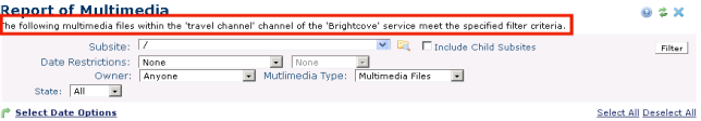 Choose Reports - Multimedia to view all video and multimedia files and playlists contained in the current site or selected subsites. In addition to the standard CommonSpot date, subsite, and owner filters, you can refine your search by filtering by files or playlists, specific hosting services, or content channels.