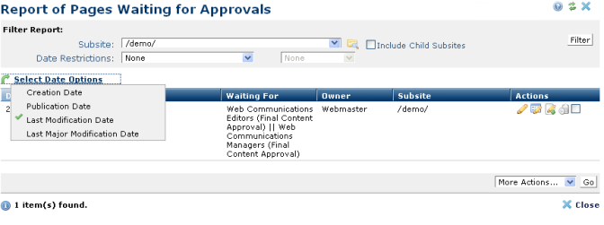 You are here: Administrators Reference > Subsite Administration > Reports > Report of Pages Waiting for Approvals