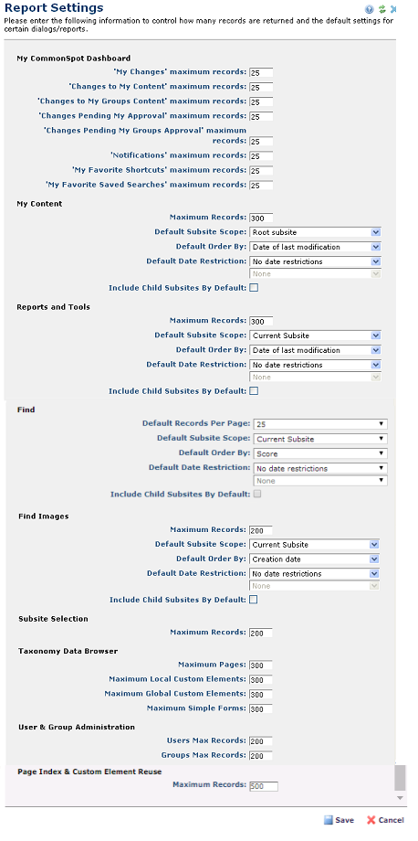 CommonSpot contributors can customize the number and type of items that display in their personal My CommonSpot dashboards, as well as set sort and display options for other frequently used dashboard options such as My Content and search results. Use Report Settings to establish defaults for these customizable displays, both to ensure that report results are meaningful and to prevent the system slowdowns that may occur when report criteria require a large number of lookups or produce a large number of results.