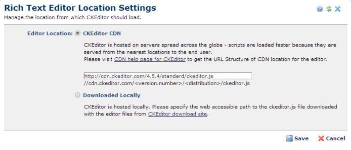 CommonSpot's uses the industry-standard CKEditor for browser-based WYSIWYG (What You See is What You Get) rich text editing, enabling non-technical contributors to quickly create and format content for the Web. CKEditor is automatically distributed over a content delivery network (CDN), a large distributed system of servers deployed in multiple data centers across the Internet for efficient product and update delivery. Sites have the option of running the CKEditor from the distribution service or downloading and running it from local servers. Use this dialog to tell CommonSpot where the CKEditor is hosted.
