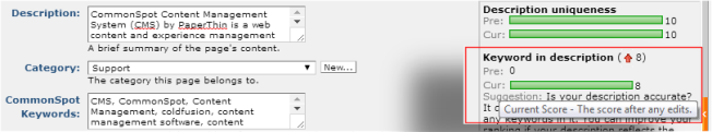 Contributors to specific pages can see the page’s current grade, and scores for each individual rule, and can see both "pre"and "current" change scores when editing content to see how updates affect SEO score. CommonSpot also provides recommendations for how to improve content/metadata for optimal results. See Create New Page in the Contributor's Reference and SEO Field Help.