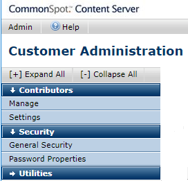 Use this option from the left panel of the CommonSpot Customer Administration Dashboard to set security for individuals and groups. Click General Security to display the Customer General Security dialog. Click Password Properties to display the Password Propertiesdialog.