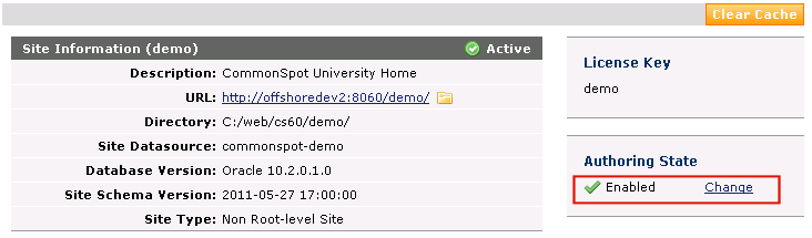Authoring State: Enables/disables site-wide authoring. You (or a scheduled process) can temporarily disable authoring within all sites or a given subsite. Use this option for periodic site maintenance.You need to disable authoring for site upgrades, migration or database conversion. Options here are identical to those available for setting the server-wide authoring state, but affect the current site/subsite only. See Authoring State for details on using this option.