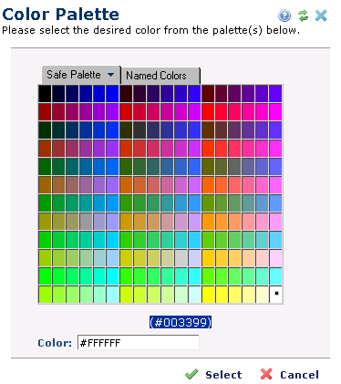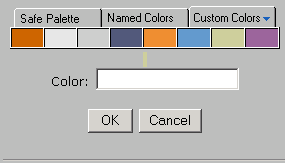 The palette may present the following color tabs: Browser Safe Palette, Named Colors and Custom Colors. The available tabs are defined within the CommonSpot Administrator interface. When you fly over a color in the Named Colors palette, the actual name of the color is displayed. Select the preferred color by clicking on it or enter the name if available; otherwise enter the RGB corresponding number.