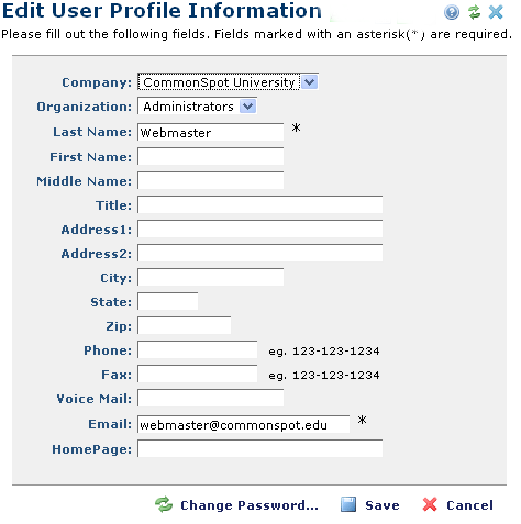 Use the Edit User Profile Information dialog to view current contact information, company name, organization, and homepage. Click Profile in the top right corner of the CommonSpot dashboard to view or change this information.