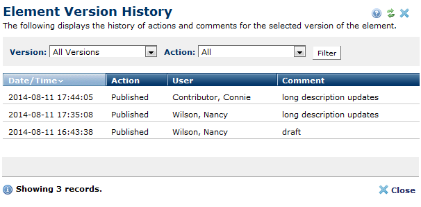 CommonSpot lists available versions. Click to sort by column head. Pick from the dropdowns to filter by specific version or content state. Selecting a specific version gives you the option to revert on closing.