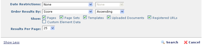 Show: Select the CommonSpot file types to return for your query. Defaults to showing all except Custom Element data. Explicitly select this item to include data contained in Custom Elements in your search.