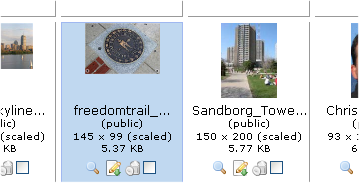 For each image returned, CommonSpot displays standard format, file size, and dimension information, and status:
