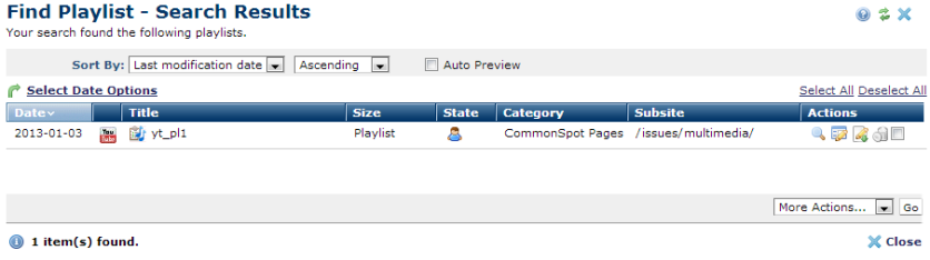 This dialog displays when you apply the playlist filter when editing a saved multimedia search or creating an advanced multimedia search. Use this dialog to view, sort, change, or manage existing files. You can also upload new multimedia from this dialog. CommonSpot uses a weighted algorithm for retrieving results, assigning more weight to whole word matches, with additional points for keyword or tag matches and search engine score.