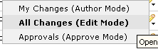 Select a mode for viewing the page. Selecting My Changes or All Changes, as shown above, opens the selected page for editing. Approvals opens the page for your review and approval.