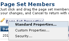 Page Set Properties link at the top of the dialog to display or change Standard or Custom Properties for the page set. View or change permissions through Page Set Security.