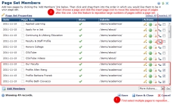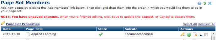 Use the Page Set Members dialog to view, add, or delete pages from a Page Set. The order of pages in this dialog determines the order pages display within a page set.
