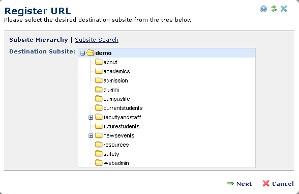 The dialog prompts for the destination subsite that contains the link to the new external page. Select a subsite and click Next to display the Register New URL dialog.