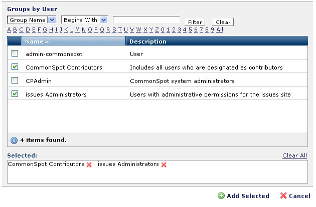Click checkboxes to select one or more groups.  Choices display in the Selected box. Click to remove groups, as shown below, or click Clear All to undo all selections. When you are finished, click Add Selected to filter results by these groups.