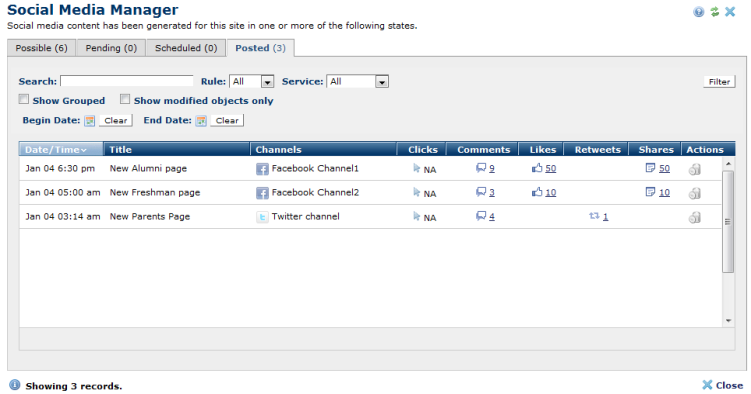 Access this dialog from the Social Media section of My CommonSpot or the Manage menu to view a report of current or planned social media posts for the site or the current page, as follows: