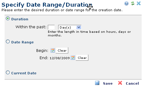 Click the calendar icon to display the Specify Date Range/Duration dialog.