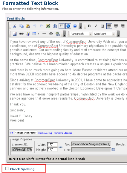When enabled in the CommonSpot Administrator, many authoring and administrative dialogs include an option to check spelling when submitting text data.