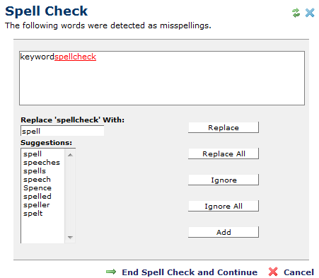 Spell check can optionally check keywords in Standard Properties or in Create New Page. Choose an option on the right to continue spell check for other fields in these dialogs or choose End Spell Check and Continue to check spelling for the current field only.