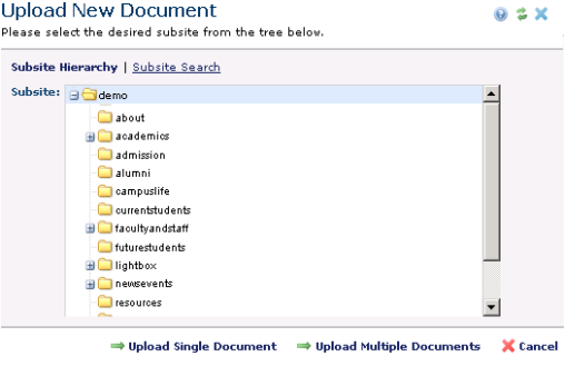 You can upload a single document or simultaneously upload multiple documents, images, or files and apply similar metadata to selected items. Upload multiple items through either the standard browse-and-select method or the drag-and-drop interface.