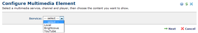 Service: Displays the video services defined for your site. Administrators configure availability through Multimedia Services. Select from the dropdown and click Next to display the following Channel and Player configuration options.