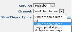 Show Player Types: You can restrict playback to single-video or playlist players or enable all types. CommonSpot supports single-file and multi-file playlist players. Player types are service-specific. Not all services support all player types. Select the appropriate player for the multimedia content you are publishing.