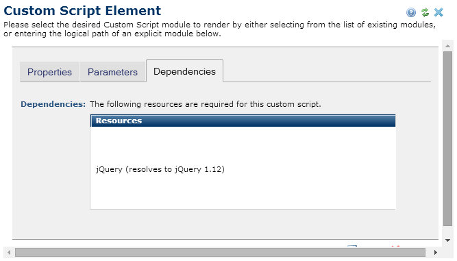 Only after the custom script has been selected and save, will you see the Depenencies Tab.You can automatically load resources and libraries required by custom modules once you register them in CommonSpot. This field displays any registered resources loaded by your custom script. See Site Administration - Resources and Libraries.