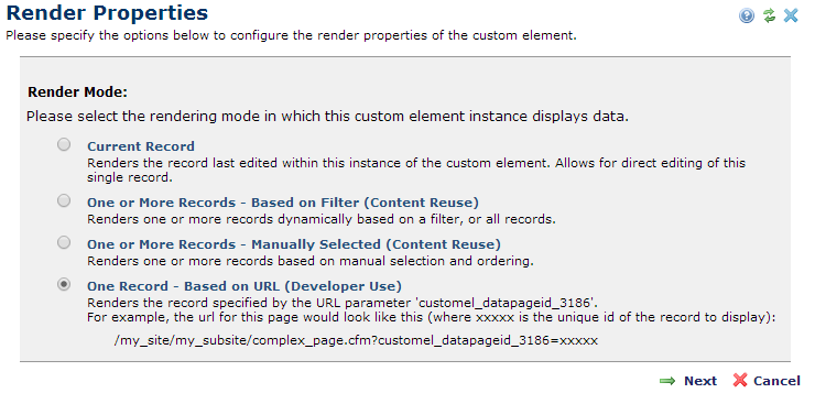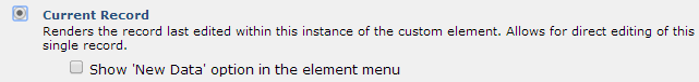 Choose this option from the Custom Element menu to select a mode for rendering Custom Element data. Use Current Record and One Record (options 1 and 4) to return or modify a single record.