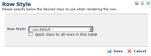 When selected, a dialog appears allowing the author to select an available class to apply to the <TR> tag for the table row. This dialog also provides an option to repeat the class assignment for all <TR> tags in the current table. The classes available in the dropdown list are defined in the Site Administration dashboard.
