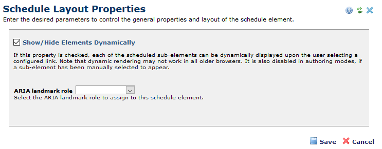 Check Show/Hide Elements Dynamically to allow hyperlinks to define which Elements within the Scheduled Element render. Because entries are dynamically generated on the page, selecting this option makes it unnecessary to set scheduling parameters.