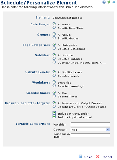 Use the Schedule/Personalize dialog to set criteria for rendering Elements contained within a Scheduled Element. To edit an existing entry, open the Schedule/Personalize Element dialog from the Define Elements to Schedule/Personalize dialog by clicking one of the edit icons and selecting Edit scheduling properties. Note that this menu also gives you the option to delete an existing Element. You can also delete Elements through the Edit Rendering Criteria dialog.