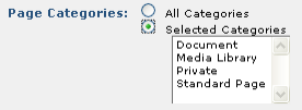 Defaults to displaying the Element for all categories. To schedule the Element to render for one or more page categories, click Selected Categories. The option will expand to include a list of existing categories. Select the desired category or categories from the list.