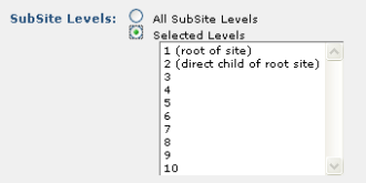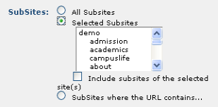 To select subsites where the URL contains a specified string, select the SubSites where the URL contains radio button. This option allows flexibility in specifying directories that have the same or similar name, but are in different parts of a site’s hierarchy.