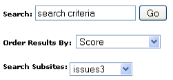 Choosing the Advanced Search Option will display a pre-formatted layout showing the search label, search field, and search button along with a selection box allowing the user to choose how the results are ordered, and a drop down list of subsites. An example of which is shown below.