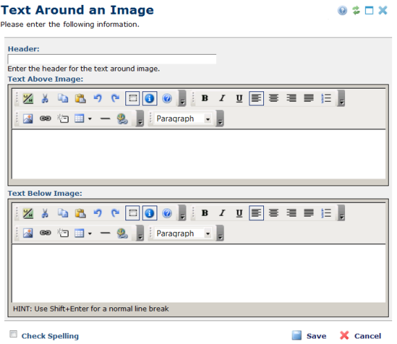 Note that the Header field is always included in the Text Around Image dialog, but CommonSpot only displays the text that you enter in this field if you select one of the layout options in the Text Around Image Layout Properties dialog that includes a header. When rich-text editing is not enabled, the Text Block field will be a simple text area.